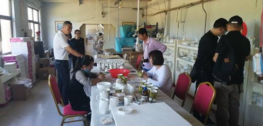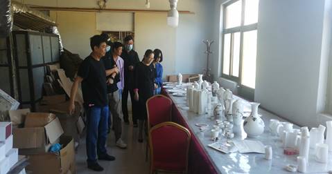 梅纳雪集团公司杨总于唐河谷旅游文创商品店接待田书记一行 ,对旅游文创商品做详细介绍。为详细了解实训基地的具体情况和文创产品制作过程,田书记一行在杨总和田厂长陪同下参观考察陶瓷生产车间和陶瓷绘画工作室。此外,还走访艺术小镇雕塑院魏老师。