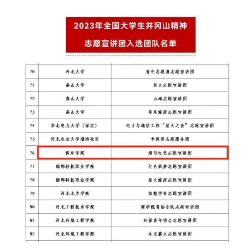 近日,由团中央青年志愿者行动指导中心、全国青少年井冈山革命传统教育基地、井冈山管理局联合发布《关于遴选2023年全国大学生井冈山精神志愿宣讲团的公告》。来自全国650所高校的1615支团队提交了申报材料。主办单位对所有材料进行了认真审阅,遴选出1000支大学生志愿服务团队。我院“漫写红色志愿宣讲团”入选全国大学生井冈山精神志愿宣讲团。