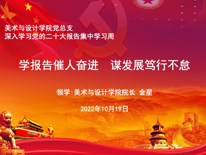 据悉,美术与设计学院党总支将利用党总支理论学习、主题党日活动、学工理论学习、主题团日活动等形式,集中在10月17日至10月21日开展深入学习党的二十大报告活动,领导干部领学、支部书记领学、党小组长领学、辅导员(班主任)领学、团总支领学,覆盖全体师生,营造浓厚学习氛围,学思践悟、知行合一,将深入领会党的二十大报告精神,落实到行动实处。