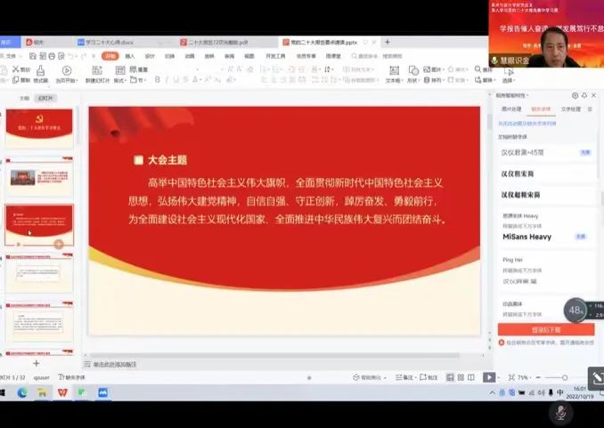 院长金星首先领学了习近平总书记报告的主题、要点和精神。金院长说:“习总书记将科教兴国和人才建设列为了建设社会主义现代化国家的基础性、建设性支撑,我们作为教师,应当积极认真学习贯彻党的二十大报告精神,从报告中汲取养分,奋力践行科教兴国的使命担当,始终奋斗在教学一线,为党和国家培养德智体美劳全面发展的社会主义建设者和接班人,不负伟大时代,不负党和人民重托。习总书记的报告总结了中国改革发展取得的重大成就和伟大经验,用词表述平实但蕴含的力量无限,值得我们每一名老师在以后的工作生活中反复学习,切实把党中央决策部署转化为学校学科建设和人才培养的新思路、新举措。”