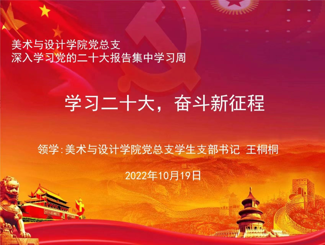 据悉,美术与设计学院党总支将利用党总支理论学习、主题党日活动、学工理论学习、主题团日活动等形式,集中在10月17日至10月21日开展深入学习党的二十大报告活动,领导干部领学、支部书记领学、党小组长领学、辅导员(班主任)领学、团总支领学,覆盖全体师生,营造浓厚学习氛围,学思践悟、知行合一,将深入领会党的二十大报告精神,落实到行动实处。