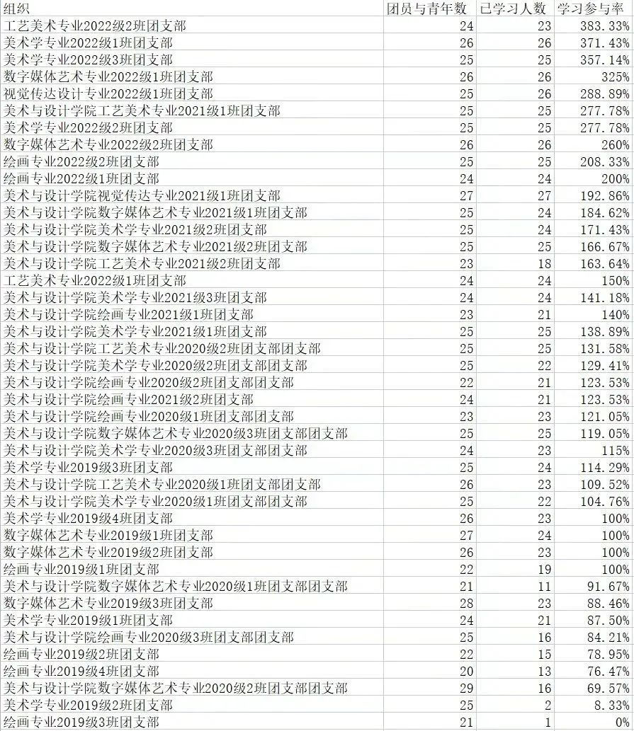 首先恭喜2022级美术学专业1班团支部,以最高的学习参与率拿下第一名,多数班级的学习率在100%以上。2019级绘画专业3班团支部和2019级美术学专业2班团支部的学习参与率低,需要继续努力!在下一期学习中,希望各班级继续加油,共同来提高我们美术与设计学院的学习率!