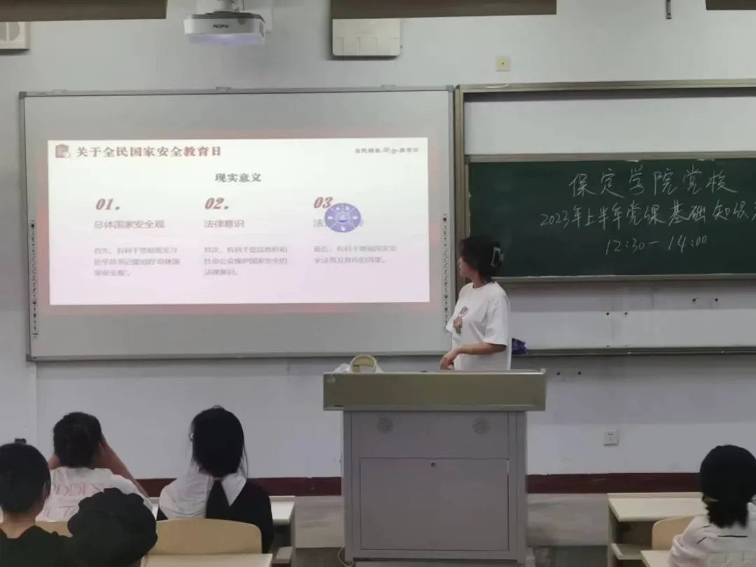 为全面落实党的二十大精神,深入贯彻总体国家安全观,进一步增强大学生对维护国家安全重要意义的认识,更好地履行在维护国家安全方面的义务,2023年6月7日下午,保定学院美术与设计学院团总支在E-1-410组织开展以“以青春筑牢保密之盾,用行动守护家国之安”为主题的团课,共计95人参加。