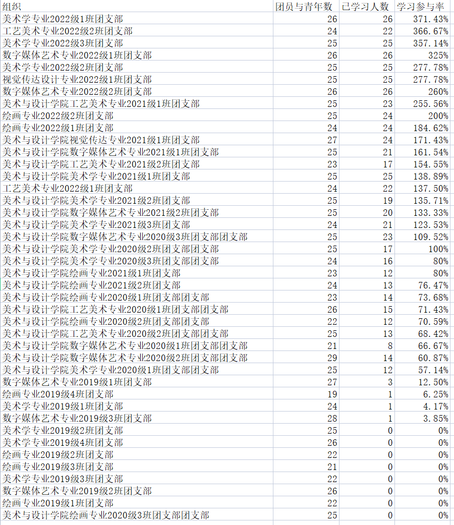 首先恭喜美术学专业2022级1班团支部,以最高的学习参与率拿下第一名,多数班级的学习率在100%以上。绘画专业2019级1班团支部和绘画专业2020级3班团支部的学习参与率低,需要继续努力!在下一期学习中,希望各班级继续加油,共同来提高我们美术与设计学院的学习率!