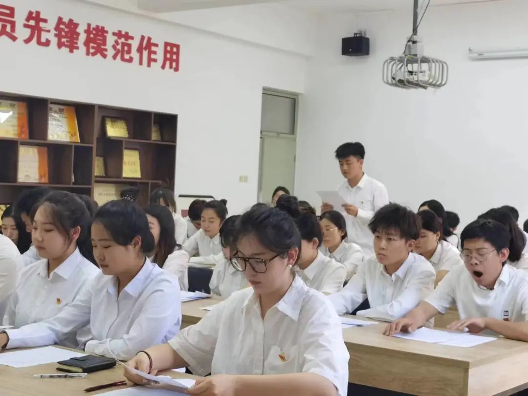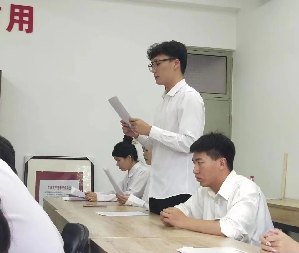 会议开始,申请转正的预备党员宣读转正申请书,入党介绍人介绍发展对象相关情况并表明是否同意其按期转正。支委会向支部大会报告征求党员和群众等意见情况和转正的意见,与会正式党员进行无记名投票,9名预备党员均全票通过,支部宣读决议同意张景宜等9名同志按期转为中共正式党员。